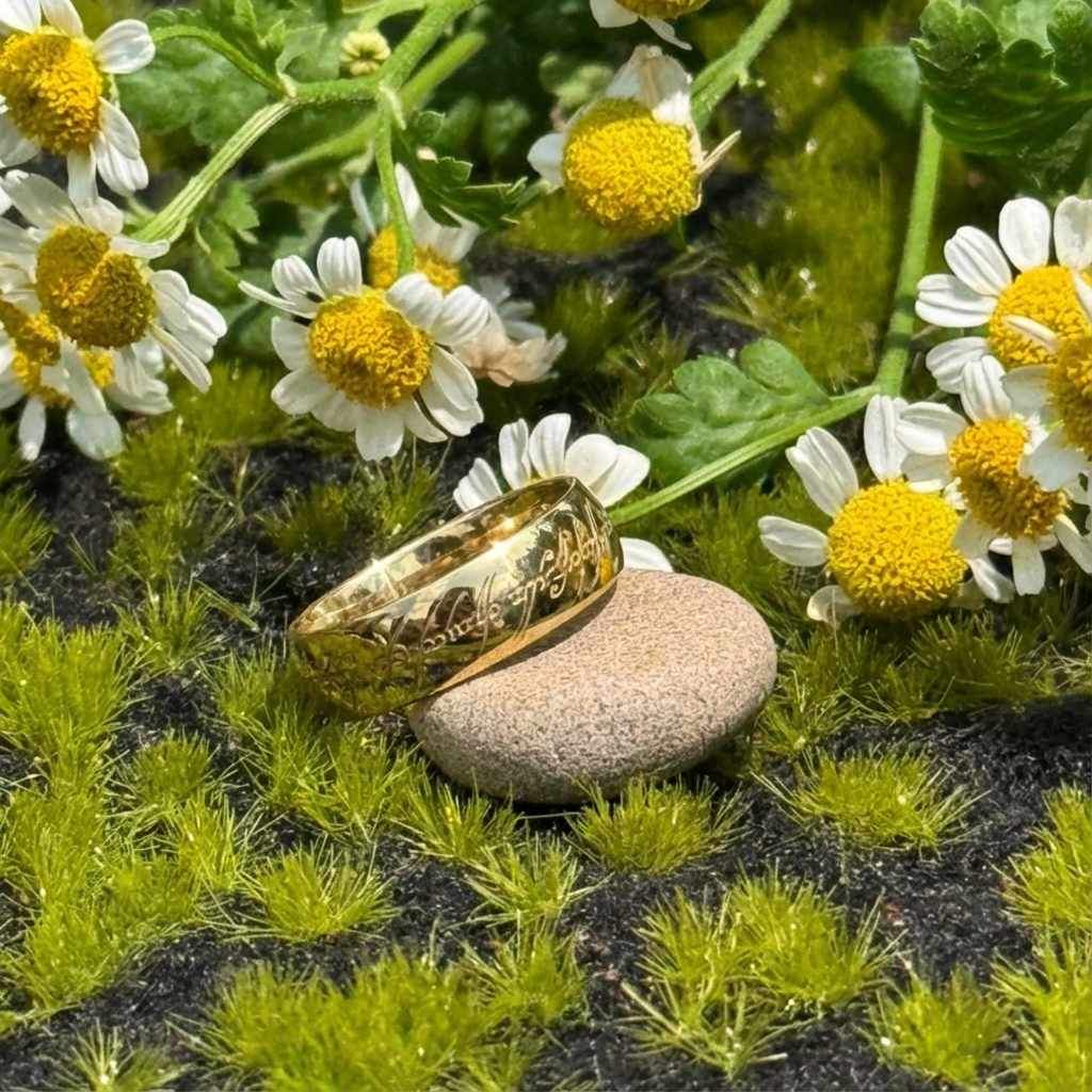 Contém um amuleto de aço inoxidável: Anel de Poder dourado com escrituras élficas